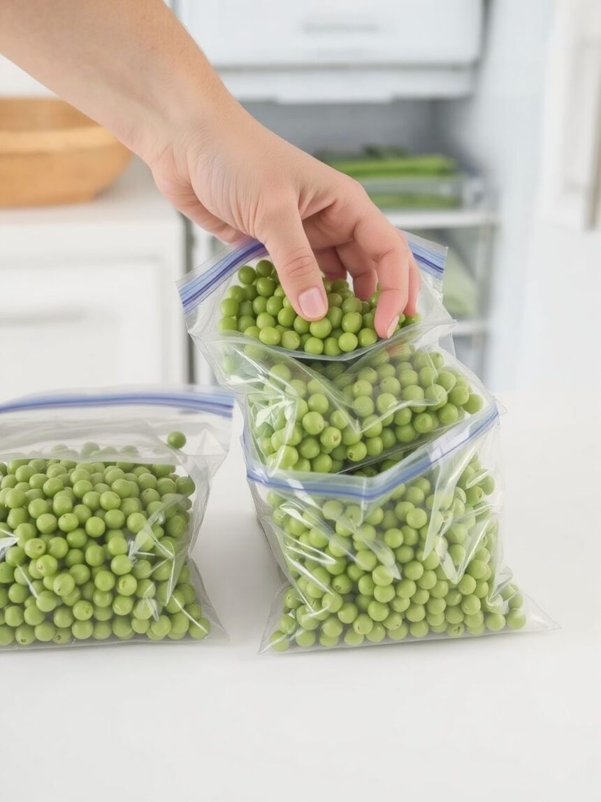 - Tipp: Töltsük meg a zacskókat annyi borsóval, amennyit egy adagban felhasználnánk. Nyomjuk ki belőlük a lehető legtöbb levegőt, mielőtt lezárnánk őket. Használhatunk szívószálat a levegő kiszívására, vagy egyszerűen csak nyomjuk le a zacskót a pult széléhez, hogy a levegő távozzon.
